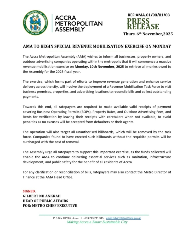 The Accra Metropolitan Assembly (AMA) will, from next Monday, November 10, 2025, deploy a special task force to recover all outstanding revenues owed to it for the 2025 fiscal year.