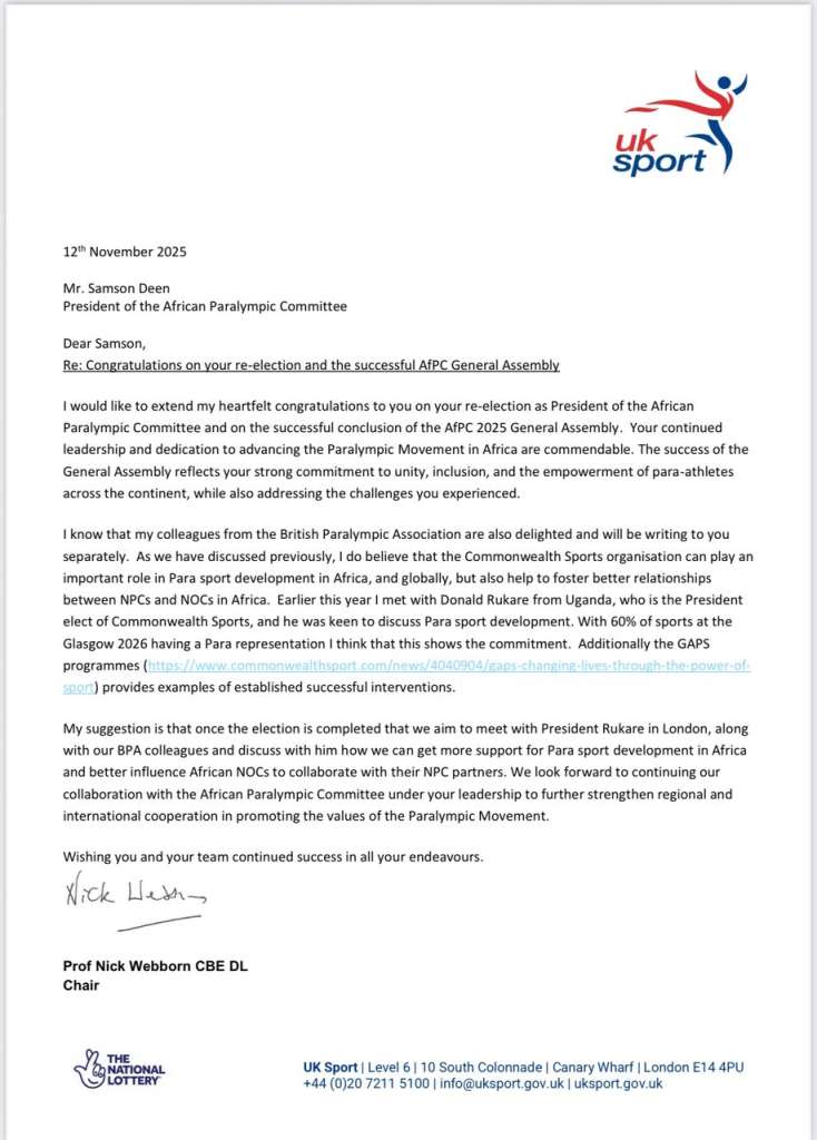 We look forward to continuing our collaboration with the African Paralympic Committee under your leadership,” Prof. Webborn wrote, reaffirming the UK’s commitment to building stronger, more inclusive international partnerships rooted in shared Paralympic values.